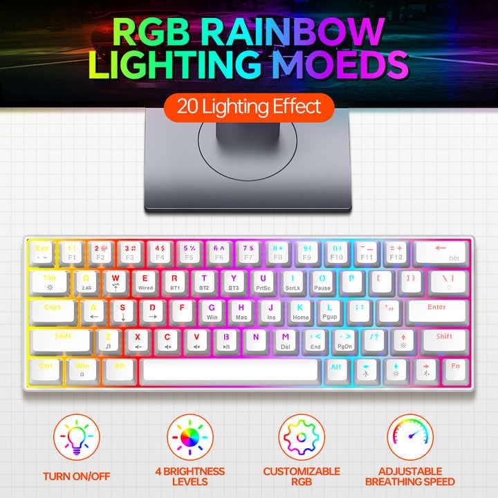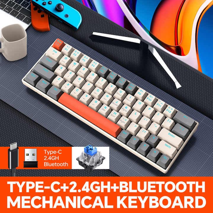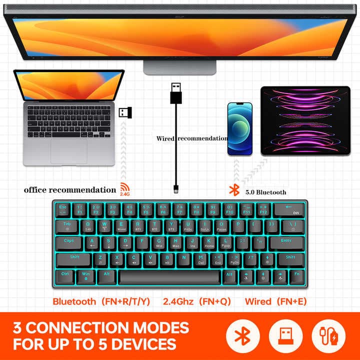 🖥️ Mini Clavier Sans Fil - Ergonomique Mécanique 60 % – Compact & RGB Clavier filaire compact (61 touches) conçu pour libérer de l’espace sur le bureau tout en offrant une frappe mécanique précise et un rétroéclairage RGB personnalisable. Caractéristiques : Format 60 % (61 touches) : sans pavé numérique pour gagner de la place Switchs mécaniques pour confort de frappe et durabilité LED RGB avec modes d’éclairage variés Antighosting complet + compatibilité plug & play Câble USB‑C détachable, boîtier ABS robuste (500–800 g environ) Avantages : Mobilité accrue : design ultra compact et transportable Idéal pour gamers, programmeurs ou environnements réduits Esthétique immersive avec rétroéclairage multicolore Installation immédiate, sans logiciel